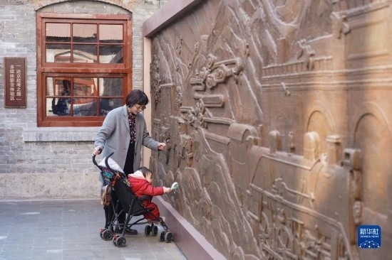3月25日,一位游客帶著孩子參觀清華園車(chē)站舊址內(nèi)的一處浮雕。