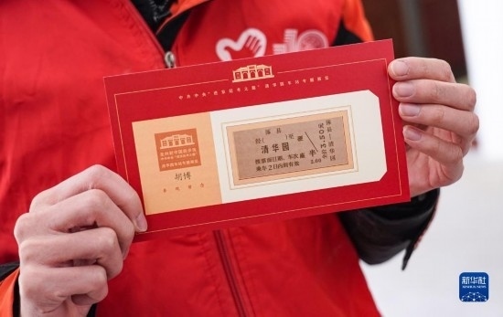 3月25日,在清華園車(chē)站舊址的專(zhuān)題展覽廳內(nèi),一名志愿者展示印有“老車(chē)票”的紀(jì)念卡片。