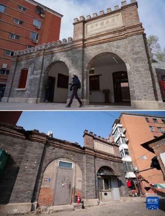 這是一張拼版照片:上圖是修繕后對(duì)外開(kāi)放的清華園車(chē)站舊址(2023年3月25日攝);下圖是修繕前的清華園車(chē)站舊址(2021年4月7日攝)。