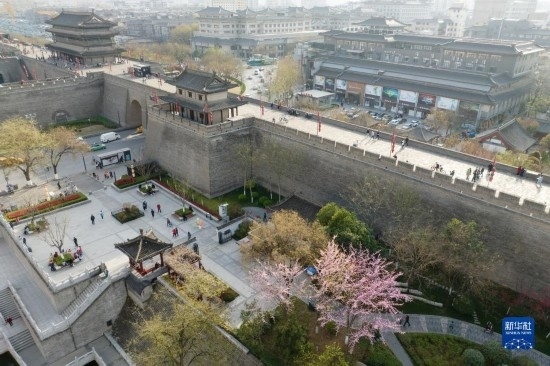 這是西安明城墻長(zhǎng)樂(lè)門景色(3月25日攝,無(wú)人機(jī)照片)。