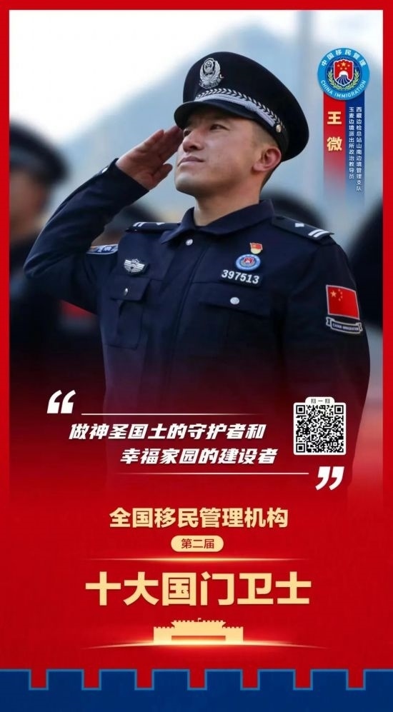 國家移民管理機構(gòu)十大國門衛(wèi)士每3年評選表彰一次,獲評人員是全國移民管理警察隊伍中政治立場堅定、能力素質(zhì)過硬、工作實績卓著、紀(jì)律作風(fēng)優(yōu)良、模范作用顯著的先進典型,是新時代移民管理警察的杰出代表。他們忠誠履職、無私奉獻,在捍衛(wèi)國家政治安全、維護國門邊境穩(wěn)定、促進經(jīng)濟社會發(fā)展過程中作出了突出貢獻,生動反映了國家移民管理體制改革的豐碩成果,展示了移民管理警察良好精神風(fēng)貌,展現(xiàn)了移民管理機構(gòu)新形象、新作為。