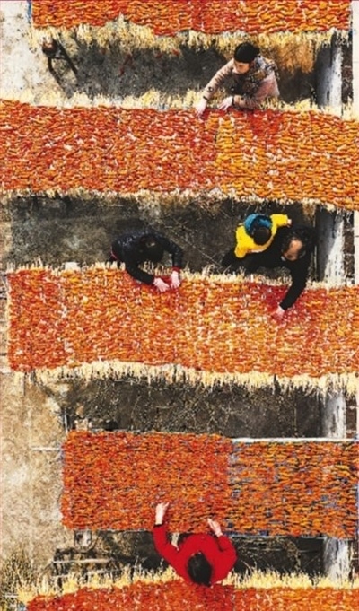 2022年12月16日,湖南省永州市新田縣枧頭鎮(zhèn)大觀堡村,村民在晾曬紅薯干。近年來,該縣利用訂單服務(wù)和農(nóng)村電商平臺,實現(xiàn)農(nóng)產(chǎn)品線上線下銷售。 劉貴雄攝(人民視覺)