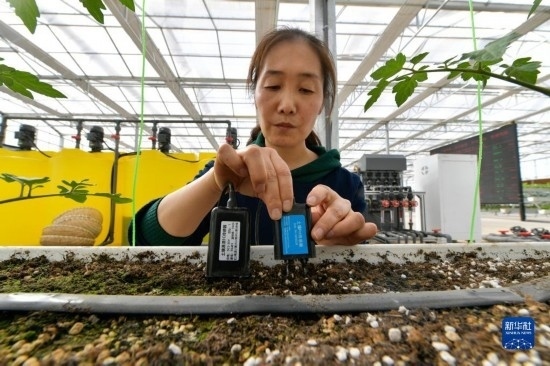 在張掖市甘州區(qū)黨寨鎮(zhèn)陳寨村玻璃智能溫室內(nèi),工作人員展示手機(jī)上的智能溫室操控系統(tǒng)(4月10日攝)。