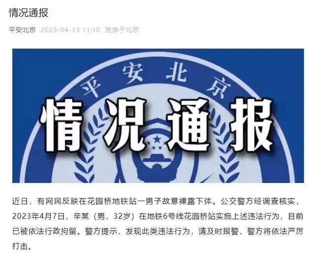 ·北京警方通報男子在地鐵站故意裸露下體:已依法行政拘留。