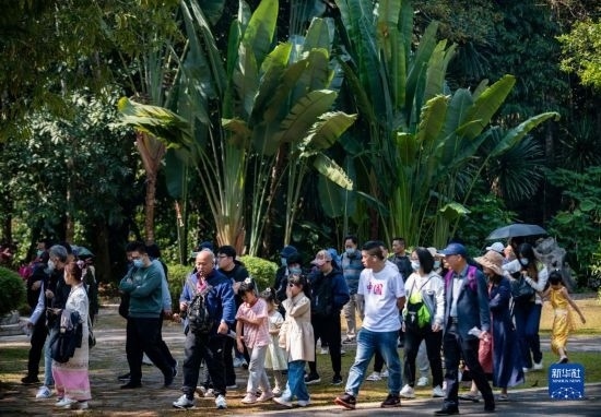 游客在位于云南省西雙版納州勐臘縣勐侖鎮(zhèn)的中國科學院西雙版納熱帶植物園內游覽(2023年2月12日攝)。