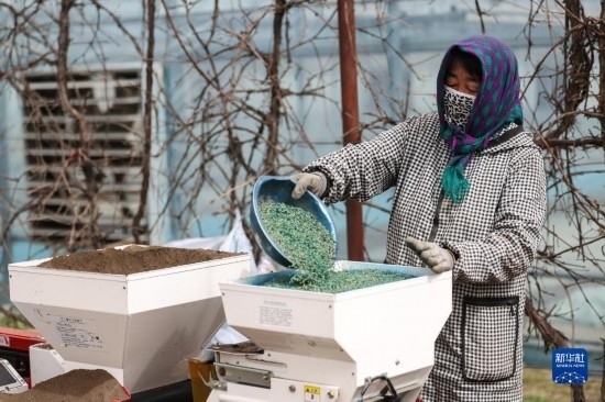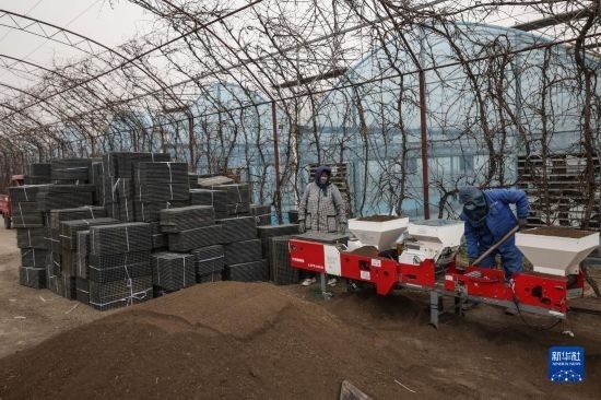 4月14日,盤錦市盤山縣的農(nóng)戶在進(jìn)行水稻秧苗育苗工作。
