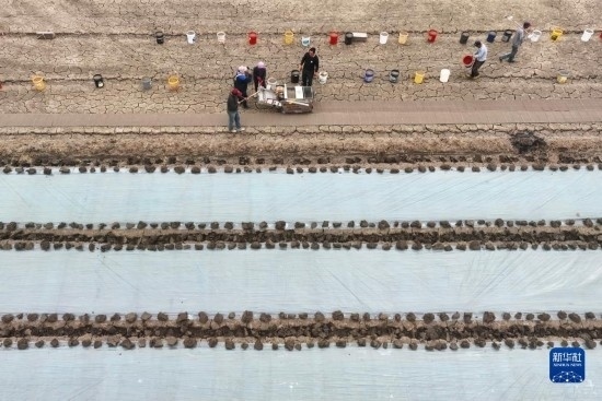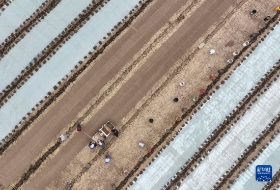 4月18日,唐山市豐南區(qū)西葛鎮(zhèn)的農(nóng)民在田間使用機(jī)械設(shè)備育秧(無(wú)人機(jī)照片)。