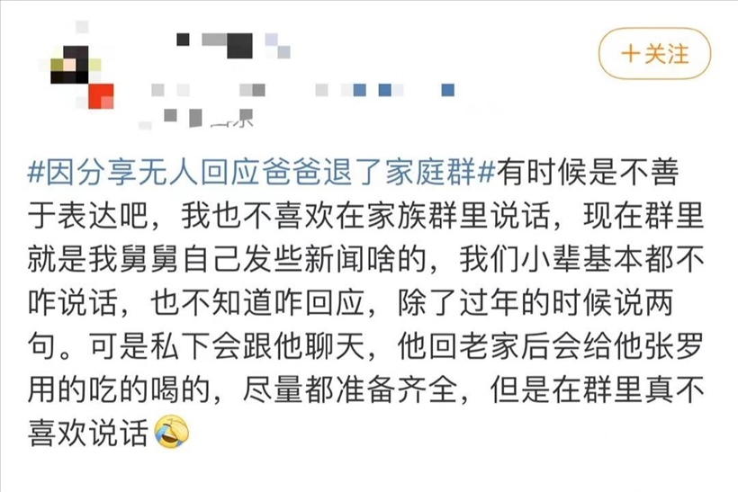 但張爸爸對家庭群的“冷清”同樣表示理解,“退群后,也有親戚私聊我進(jìn)行解釋,說實在是比較忙所以沒有回應(yīng)?,F(xiàn)在大家的工作壓力比較大,同輩的親戚和孩子們工作都很忙,并且大家因為生活、工作、經(jīng)歷的不同造成漸行漸遠(yuǎn)”。