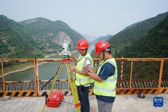5月4日,在重慶市北碚區(qū)渝武高速復線觀音峽嘉陵江特大橋,中交一公局四公司橋梁工區(qū)工作人員孫培耕(右)和彭昭屏在對橋面高程及軸線偏位進行測量。