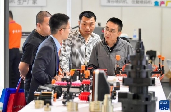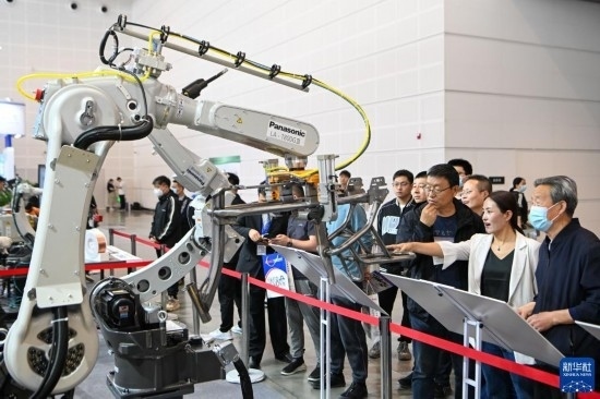 5月8日,在國家會展中心(天津),觀眾參觀展會上展出的工業(yè)設(shè)備。