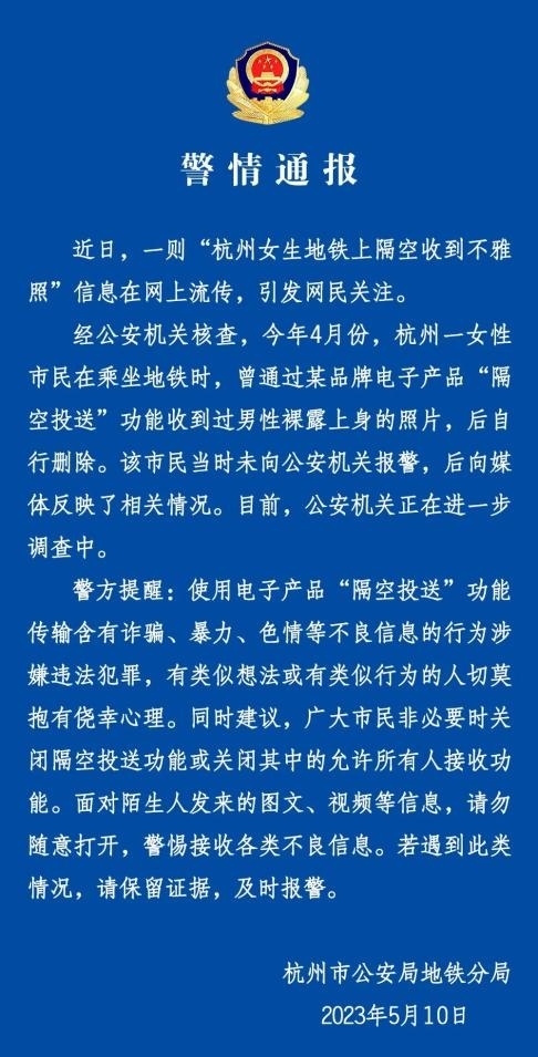 ·杭州一女子地鐵上隔空收到不雅照,警方回應(yīng):正在進一步調(diào)查。