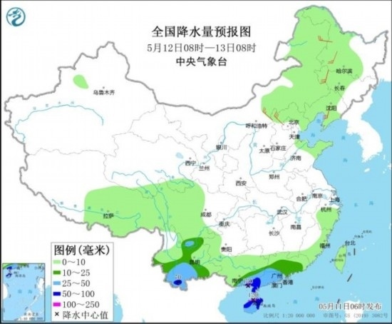 全國(guó)降水量預(yù)報(bào)圖(5月12日08時(shí)-13日08時(shí))