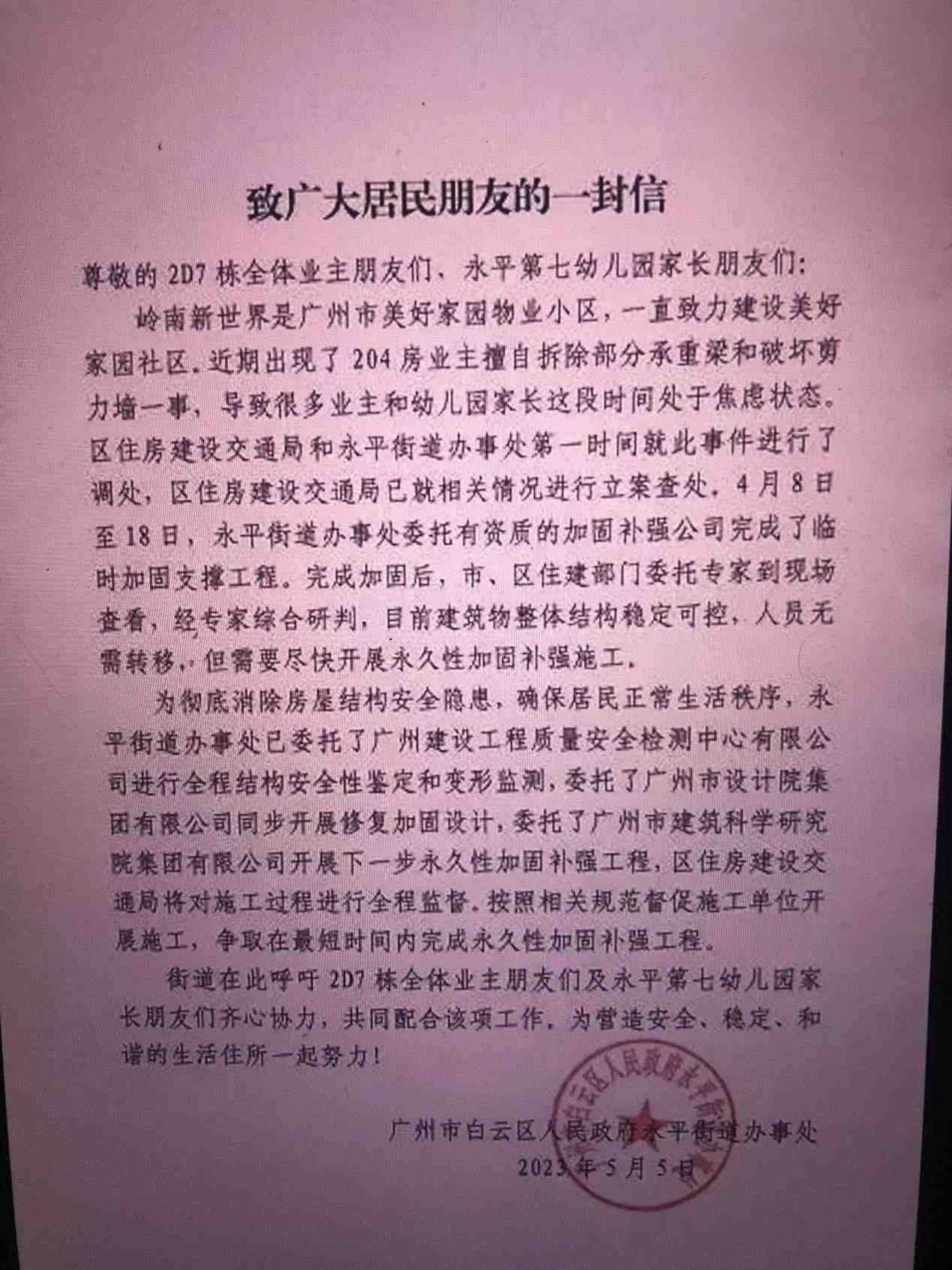 ·“廣州一租戶私拆承重墻”追蹤:已臨時加固,業(yè)主擬聯(lián)合起訴。