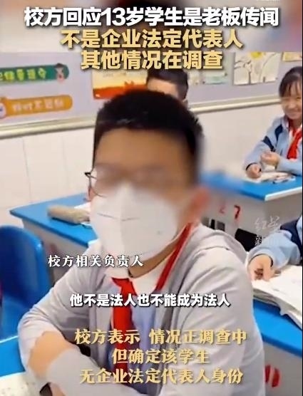 ·校方回應(yīng)網(wǎng)傳13歲學生是公司老板: 不是企業(yè)法定代表人,其他情況在調(diào)查。