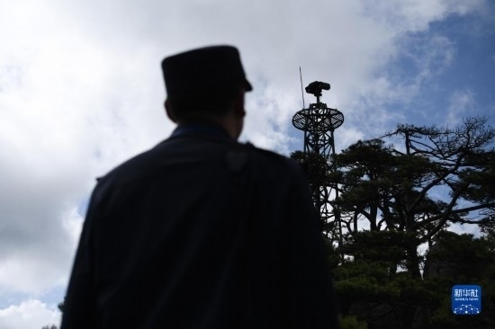 4月20日,在黃山風(fēng)景區(qū),瞭望哨防火小隊隊員汪新平在用望遠鏡觀測山林。