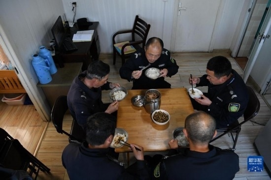 4月20日,在黃山風(fēng)景區(qū)平天矼瞭望哨內(nèi),瞭望哨防火小隊5名隊員在吃晚飯,右一為秦志平。