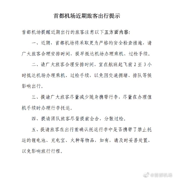 央視網(wǎng)消息:5月16日,@首都機(jī)場(chǎng) 官方微博發(fā)布提示:首都機(jī)場(chǎng)近期將采取更為嚴(yán)格的安全檢查措施,請(qǐng)廣大旅客合理安排時(shí)間,提早抵達(dá)機(jī)場(chǎng)辦理乘機(jī)、過(guò)檢手續(xù)。