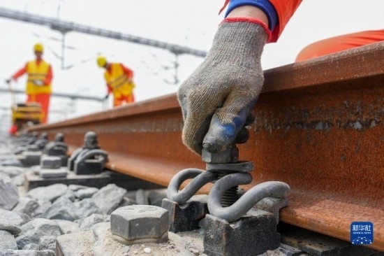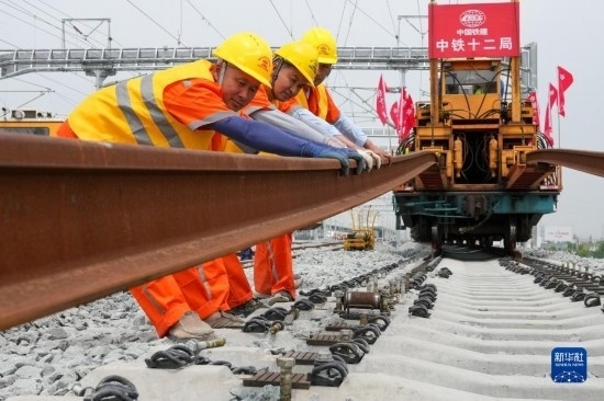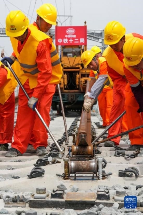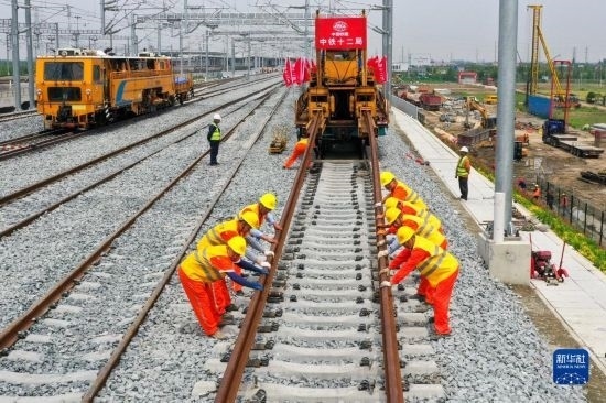 5月20日,在滬寧沿江高鐵太倉站施工現(xiàn)場,中鐵十二局的工程人員準(zhǔn)備進(jìn)行螺栓緊固作業(yè),將對(duì)接好的鋼軌固定。