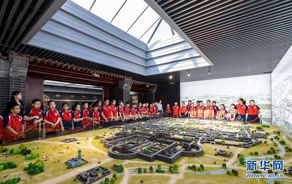 5月17日,呼和浩特市玉泉區(qū)南茶坊小學(xué)學(xué)生在歸化城展示館參觀牌樓微縮模型。新華網(wǎng)發(fā)(丁根厚攝)