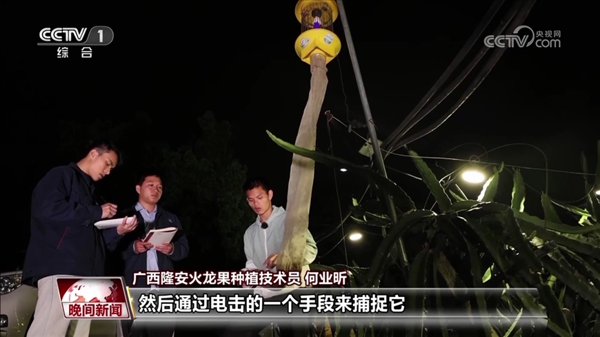 隆安火龍果種植技術(shù)員 何業(yè)昕:這個(gè)燈的話叫做幼蟲燈,主要是通過一個(gè)燈光發(fā)出了一些光譜來(lái)吸引一些害蟲來(lái),然后通過電擊的一個(gè)手段來(lái)捕捉它,然后集合到這個(gè)袋子里面。像這種燈的話,我們一般是20到25畝地放一盞,一個(gè)物理防治的手段。