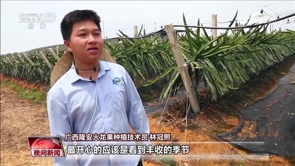 隆安火龍果種植技術(shù)員 林冠熙:不再是以前的那種面朝黃土背朝天的農(nóng)業(yè)模式,有時(shí)我們可能在電腦面前點(diǎn)開開關(guān),我們就可以給植物灌水灌肥。最開心的應(yīng)該是看到豐收的季節(jié),看到滿地滿果通紅的畫面,就覺得這是豐收的喜悅。