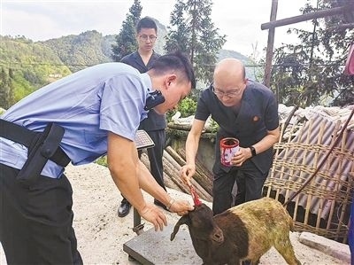 圖②:執(zhí)行干警對(duì)稱(chēng)重后的山羊進(jìn)行標(biāo)記。