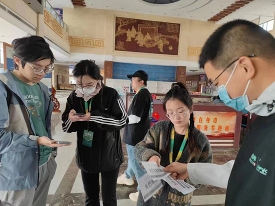 在高鐵曲阜東站,志愿者幫助樂(lè)迷了解音樂(lè)節(jié)接駁車(chē)行駛路線及乘坐流程。徐晨光/攝