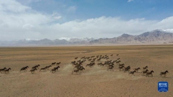 一群藏野驢在阿爾金山國家級自然保護(hù)區(qū)奔跑(5月23日攝,無人機(jī)照片)。