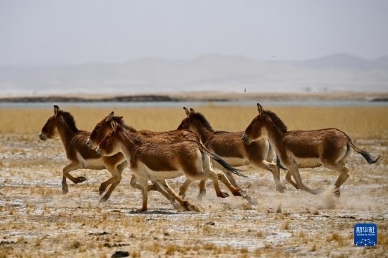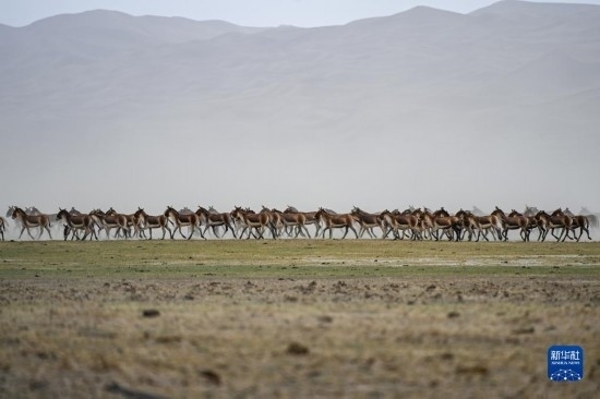 一群藏野驢在阿爾金山國家級自然保護(hù)區(qū)奔跑(5月23日攝)。