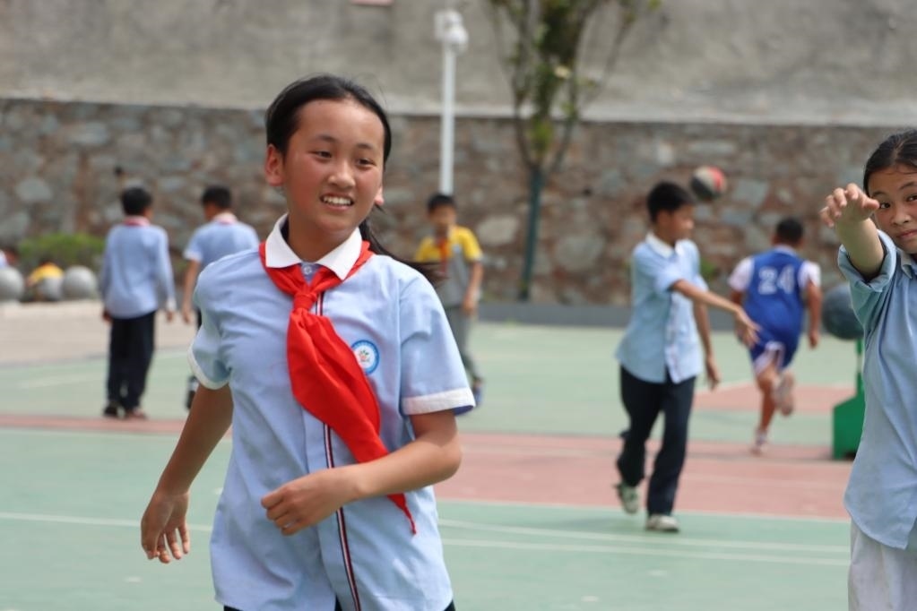 5月30日,貴州省榕江縣古州鎮(zhèn)第四小學四年級學生楊文源(右)在體育課上和同學一起打籃球。新華社記者 鄭明鴻 攝