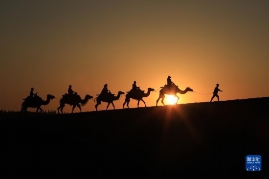 6月7日清晨,在甘肅敦煌鳴沙山月牙泉景區(qū),游客騎乘駱駝感受大漠風(fēng)光。