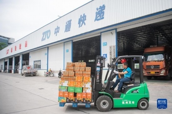 6月8日,在秭歸縣華維電商物流園區(qū)內(nèi),工作人員搬運(yùn)臍橙。