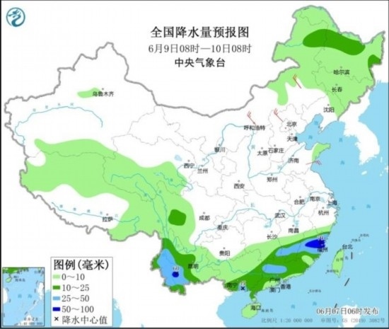 7-9日,江南、華南、云貴高原、四川南部等地有中到大雨,局地有暴雨,小時雨量20-50毫米,局地可達60毫米以上;華北、黃淮、東北地區(qū)等地有陣雨或雷陣雨,局地伴有雷暴大風(fēng)或冰雹等強對流天氣,中央氣象臺6月7日06時發(fā)布強對流天氣藍色預(yù)警。