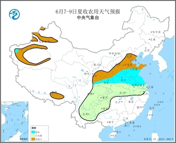 預(yù)計6月7-9日,夏收區(qū)大部多晴好天氣,利于搶晴收曬已成熟冬小麥和加快夏收進(jìn)度;河南、陜西等地前期降水偏多地區(qū)的低洼麥田漬澇將減輕,為麥?zhǔn)諜C(jī)械化作業(yè)逐步創(chuàng)造條件。未來3天,河北中東部和南部、河南北部、山西東南部、山東西部、安徽東部等地的局部地區(qū)將有雷暴大風(fēng)或冰雹等強(qiáng)對流天氣,冬小麥點(diǎn)片倒伏風(fēng)險較高,對未成熟小麥籽粒充分灌漿不利,并將增加已成熟小麥機(jī)收難度。7-14日華北、黃淮、新疆等地部分地區(qū)將有35℃以上高溫天氣,局地日最高氣溫在37℃以上,上述地區(qū)堆積的濕麥發(fā)熱霉變的風(fēng)險較高,新疆冬小麥遭受干熱風(fēng)災(zāi)害的風(fēng)險也較高。