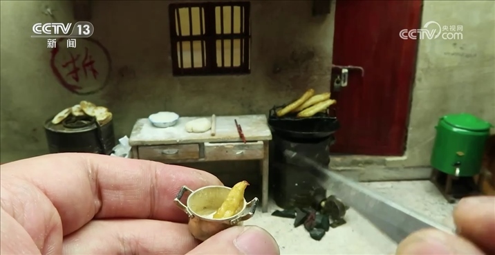 趙培藝:有一位網(wǎng)友外婆腿腳不好,沒有辦法回老家。然后他跟我說,能不能給他復原一個小的,給她放在床頭上讓她看著,大概拍了二十幾張照片,然后測量數(shù)值是測了大概三四次,他原本是什么材質,我就盡量去用什么材質,例如小的瓷磚,我都是去廠里訂的小陶瓷片,像地板之類的,我都是用手工燒的小紅磚去做。想家里了,一歪頭就能看到。