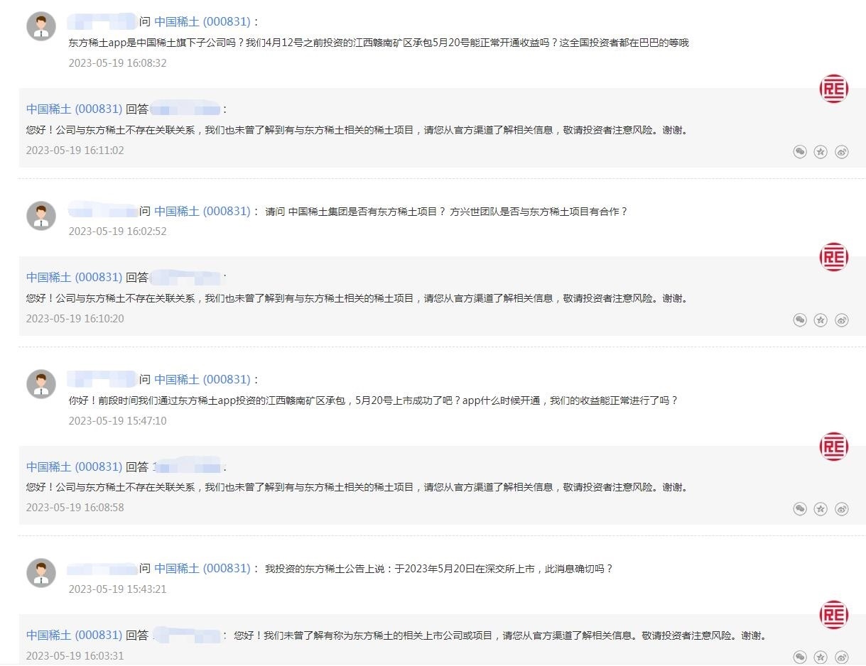 中新財經(jīng)注意到,有投資者曾在互動平臺上向中國稀土詢問“東方稀土”相關(guān)信息,從提問內(nèi)容看,可能已有投資者被誤導受騙。比如,“東方稀土APP是中國稀土旗下子公司嗎?我們4月12號之前投資的江西贛南礦區(qū)承包5月20號能正常開通收益嗎?”“我投資的東方稀土公告上說:于2023年5月20曰在深交所上市,此消息確切嗎?”等等。