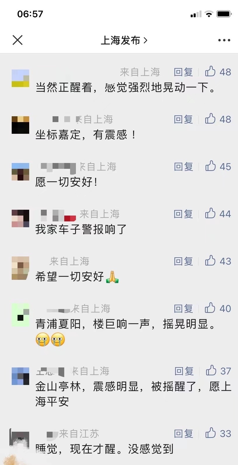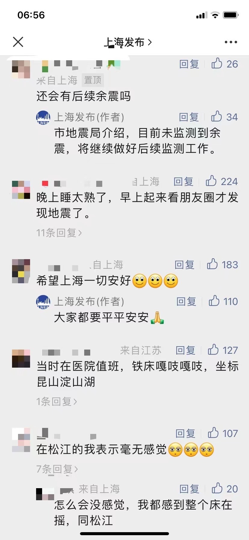 “上海發(fā)布”在微信公眾號留言中回復(fù):市地震局介紹,目前未監(jiān)測到余震,將繼續(xù)做好后續(xù)監(jiān)測工作。