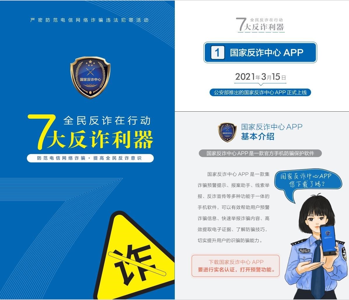 聚焦“關(guān)口前移、預(yù)防為先”,《手冊(cè)》詳細(xì)介紹了過去兩年里,公安部會(huì)同工信部、中國人民銀行聯(lián)合推出的七大反詐利器——國家反詐中心APP、96110預(yù)警勸阻專線、12381涉詐預(yù)警勸阻短信系統(tǒng)、全國移動(dòng)電話卡“一證通查”、云閃付APP“一鍵查卡”、反詐名片、全國互聯(lián)網(wǎng)賬號(hào)“一證通查2.0”的主要功能和下載查詢方法,鼓勵(lì)廣大群眾多下載多使用,共同構(gòu)筑攔截電信網(wǎng)絡(luò)詐騙的“防火墻”。
