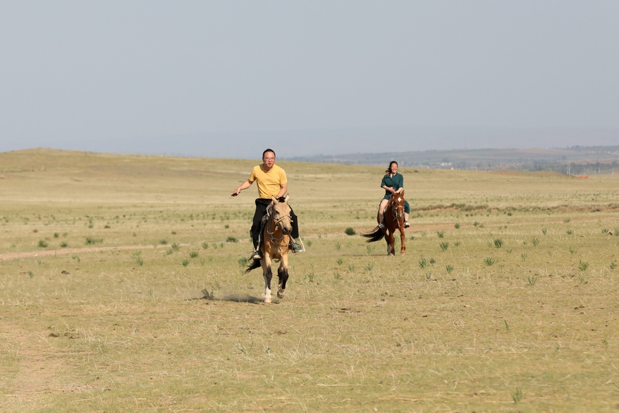 6月24日,游客在希拉穆仁草原騎馬游玩。