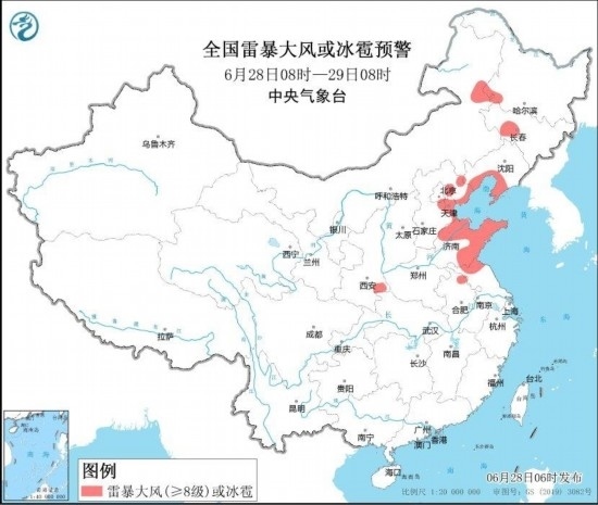 圖2 全國雷暴大風(fēng)或冰雹預(yù)報圖(6月28日08時-29日08時) 圖自中央氣象臺網(wǎng)站