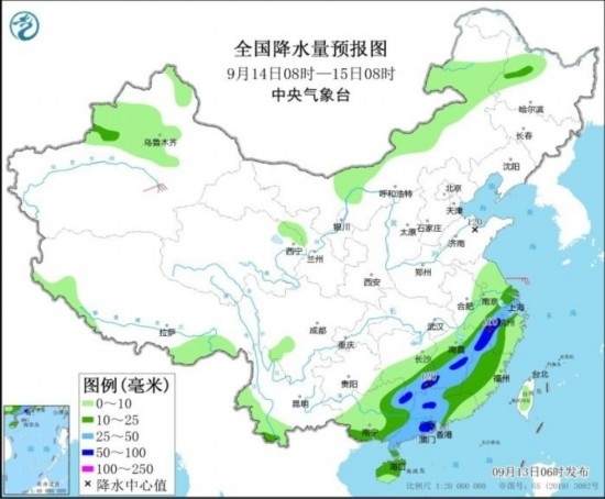 全國降水量預報圖(9月13日08時-14日08時)