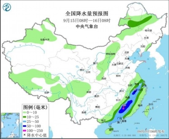 全國強降雨落區(qū)預報圖(9月14日08時至15日08時)