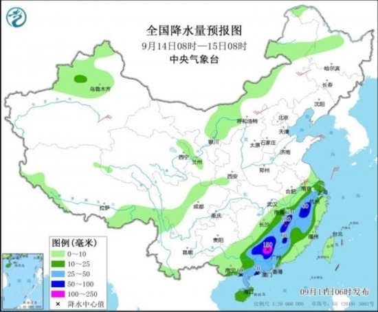 預計,9月14日08時至15日08時,安徽南部、浙江西部和北部、湖南東南部、江西東北部和中南部、福建西北部、廣東中西部、廣西東部等地部分地區(qū)有大到暴雨,其中,江西中部、廣東西北部等地部分地區(qū)有大暴雨(100~150毫米)。上述部分地區(qū)伴有短時強降水(最大小時降雨量30~50毫米,局地可超過60毫米),局地有雷暴大風等強對流天氣。中央氣象臺9月14日06時繼續(xù)發(fā)布暴雨藍色預警。