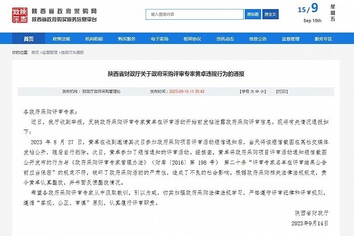 ·一名政府采購(gòu)評(píng)審專家被舉報(bào)泄露評(píng)審信息,陜西省財(cái)政廳通報(bào)。