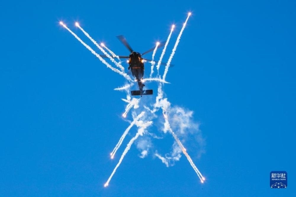 在第六屆中國(guó)天津國(guó)際直升機(jī)博覽會(huì)開幕式上,陸軍“風(fēng)雷”飛行表演隊(duì)直-20戰(zhàn)術(shù)通用直升機(jī)發(fā)射干擾彈。?