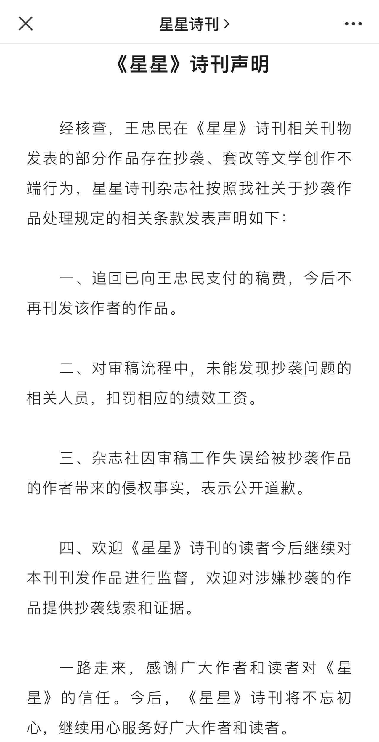 《星星》詩(shī)刊雜志社稱,按照該社關(guān)于抄襲作品處理規(guī)定的相關(guān)條款,追回已向王忠民支付的稿費(fèi),今后不再刊發(fā)該作者的作品;對(duì)審稿流程中,未能發(fā)現(xiàn)抄襲問(wèn)題的相關(guān)人員,扣罰相應(yīng)的績(jī)效工資。