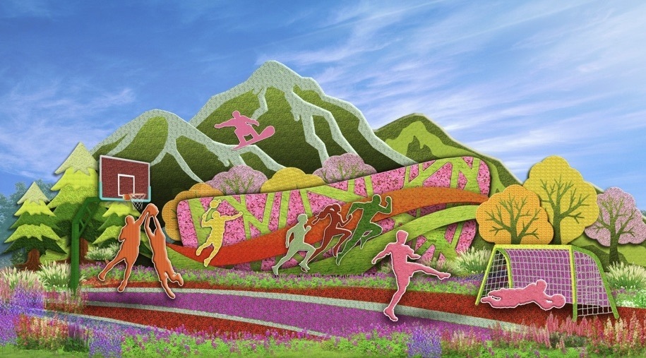 6,西單東北角的“全民健身”花壇頂高8.5米,以豐富多彩的全民健身為題材,配以籃球、羽毛球、跑步、滑雪等運(yùn)動(dòng)場(chǎng)景,寓意全民健身共享美好生活。