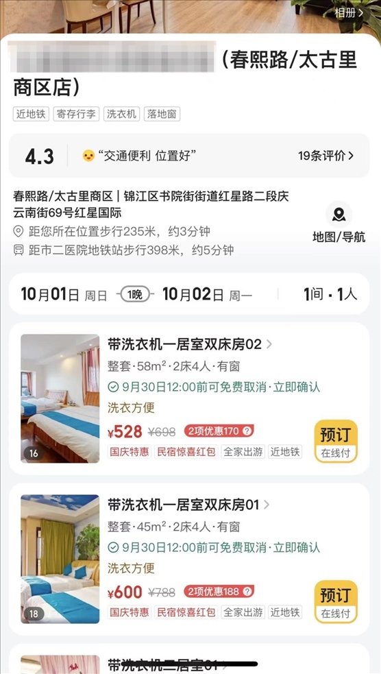 ▲位于成都市春熙路、太古里商區(qū)的某民宿一居室雙床房房型,國(guó)慶期間每晚單價(jià)為528元