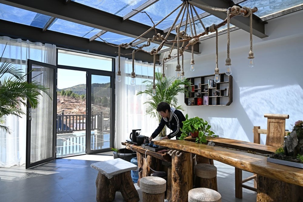 4月7日,天津市薊州區(qū)羅莊子鎮(zhèn)一家民宿的負責(zé)人在整理茶具。新華社記者 趙子碩 攝