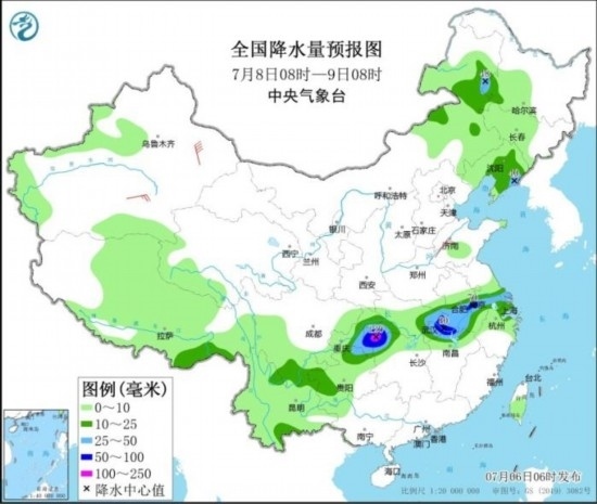 7月8日08時(shí)至9日08時(shí),內(nèi)蒙古東北部、黑龍江西南部、遼寧中東部、蘇皖南部、上海、湖北東部和西南部、江西北部、湖南西北部、重慶東南部、貴州北部等地部分地區(qū)有中到大雨,局地有暴雨或大暴雨(100~120毫米)。新疆南疆盆地等地的部分地區(qū)有4~6級(jí)風(fēng)。